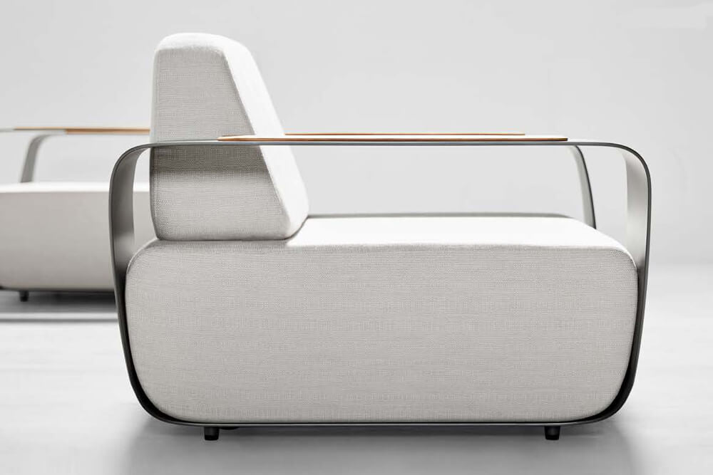 Conçue pour l'extérieur, l'équipe de conception de Pininfarina s'est inspirée du dynamisme, de l'élégance et de la pureté des vagues de l'océan, l'espace vide qui se crée lorsqu'une vague se brise, donnant lieu à une vague creuse ou tubulaire (onda en italien). Le cœur de la Collection est la structure, une bande d'aluminium qui soutient les coussins et devient l'élément emblématique de toute la Collection. Caractérisée par des lignes fluides - comme celles de la vague - la bande, au-delà d'être un élément esthétique, devient également un élément fonctionnel, un accoudoir rigide qui peut être utilisé pour appuyer des objets. Le choix des matériaux est issu de l'expérience de conception Pininfarina 360° : l'aluminium – issu du secteur automobile – pour la structure, les tissus – utilisés dans les yachts pour leur résistance – pour les coussins.