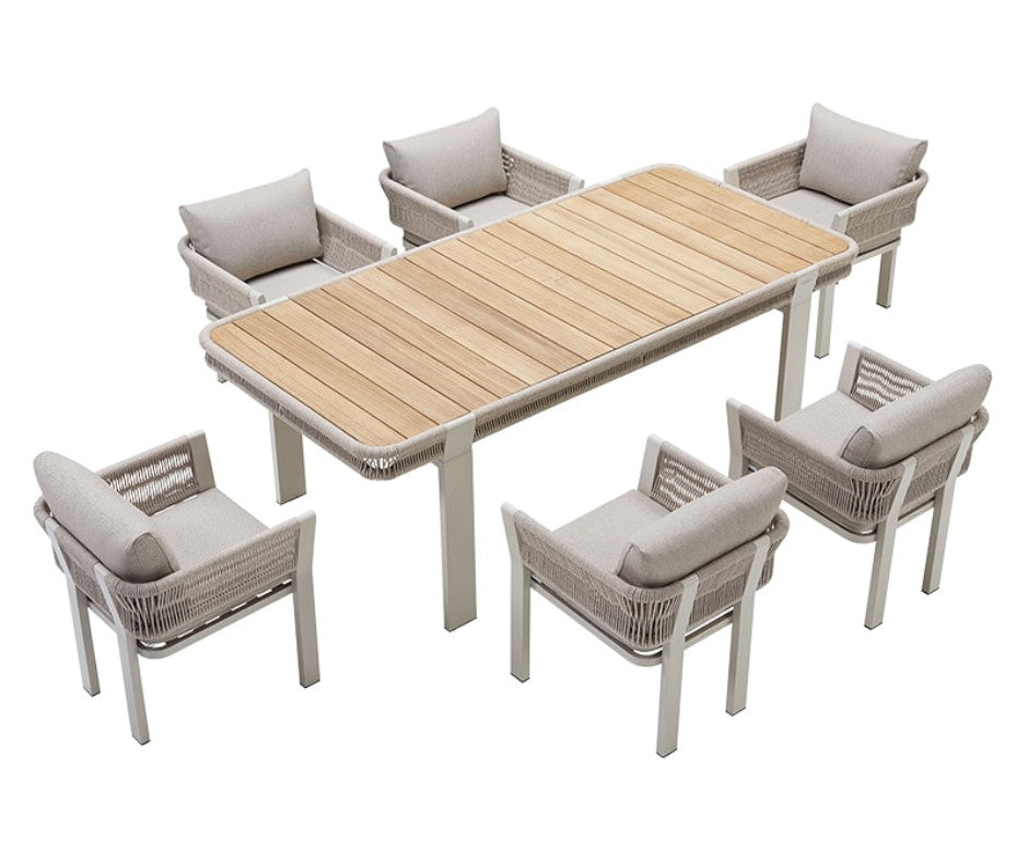Ce mobilier est composé d'une large table à manger de jardin ainsi que de six fauteuils individuels à l'assise équipée de coussins rembourrés pour vous apporter un confort des plus satisfaisant, même en mangeant.