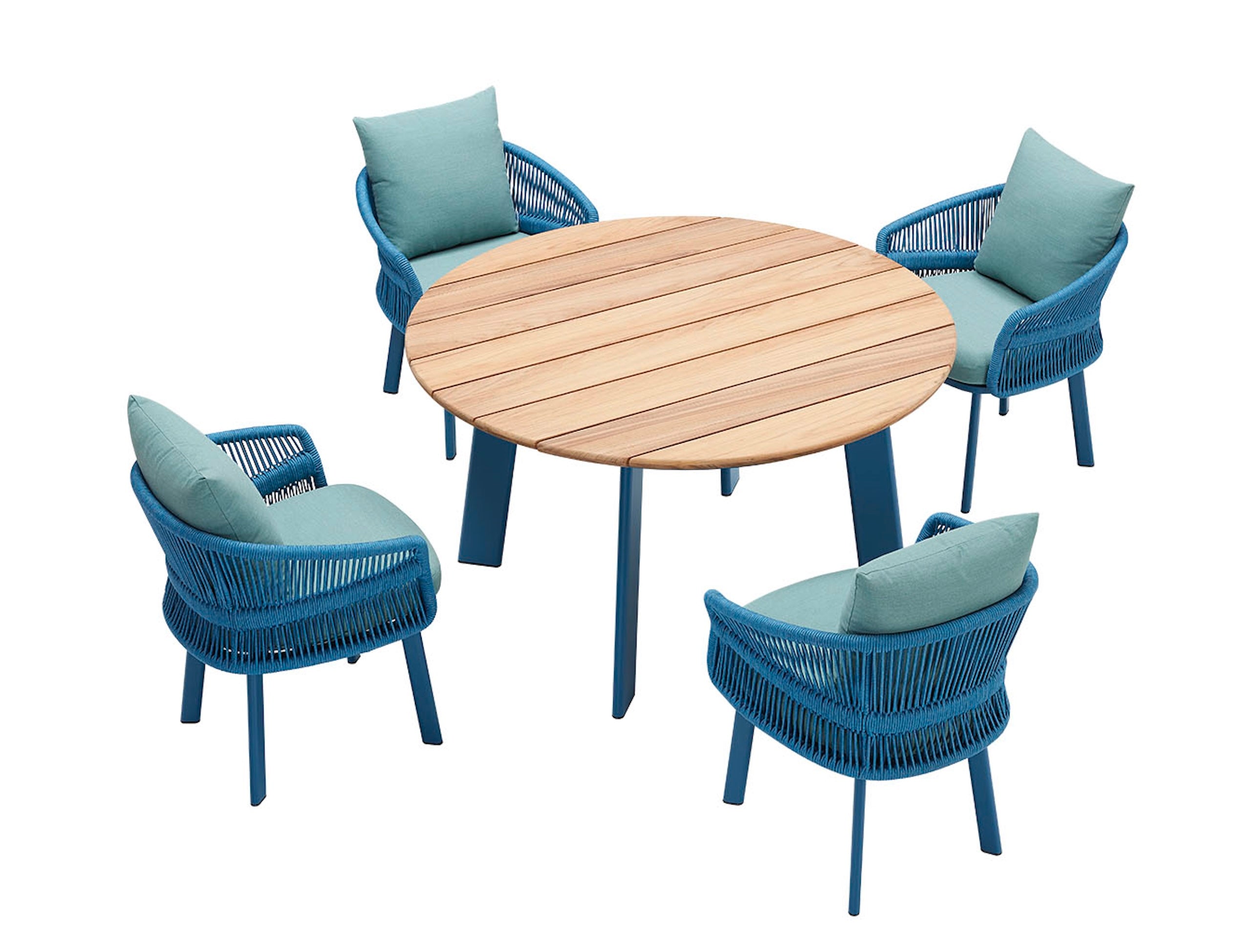 Cet ensemble est composé d'une grand table à manger ronde en teck et de 4 fauteuils. Ses cousins vous offriront un confort sur mesure et sont également déperlants, déhoussables. De plus les housses de coussins sont en fibre Oléfine* 100% polypropylène.