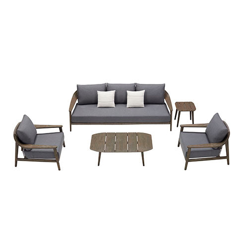Ce salon de jardin est composé de bois de teck de couleur foncé et de corde tissée, accompagné de coussins déperlants, déhoussables et lavables en machine. De plus les housses de coussins sont en fibre Acrylique teinté dans la masse.
