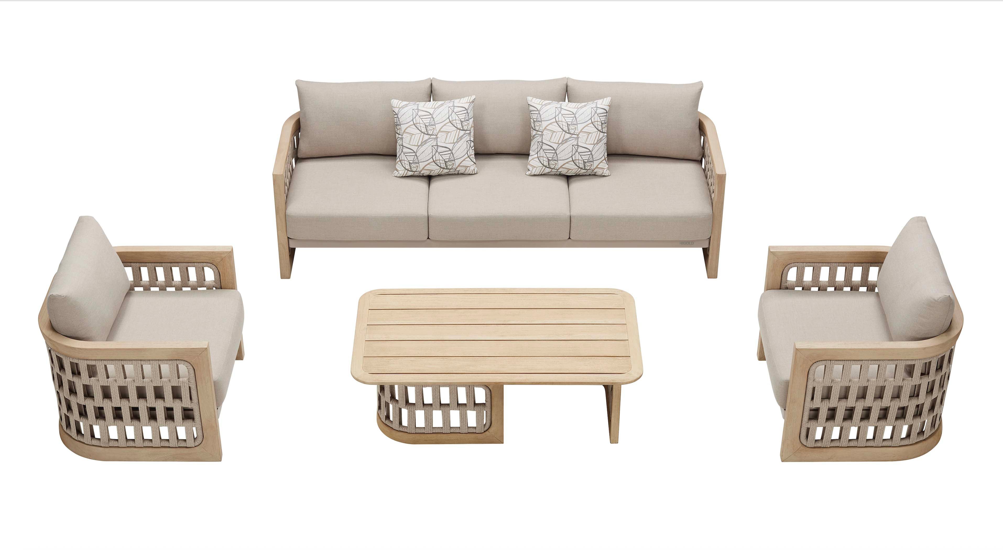 Ce mobilier de jardin est composé de bois de teck de couleur claire accompagné de coussins déperlants, déhoussables et lavables en machine. De plus les housses de coussins sont en fibre Acrylique teinté dans la masse.