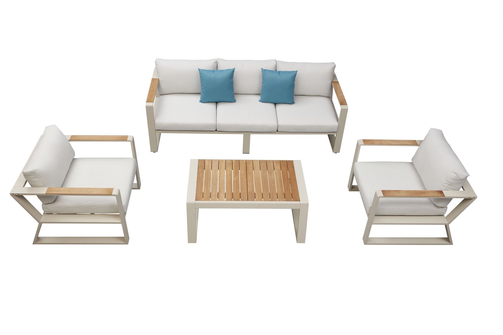 Le voici, le salon EXY ! Ce salon d'extérieur est composé d'un large canapé 3 places, d'une table basse avec un plateau en teck et de deux fauteuils individuels.
