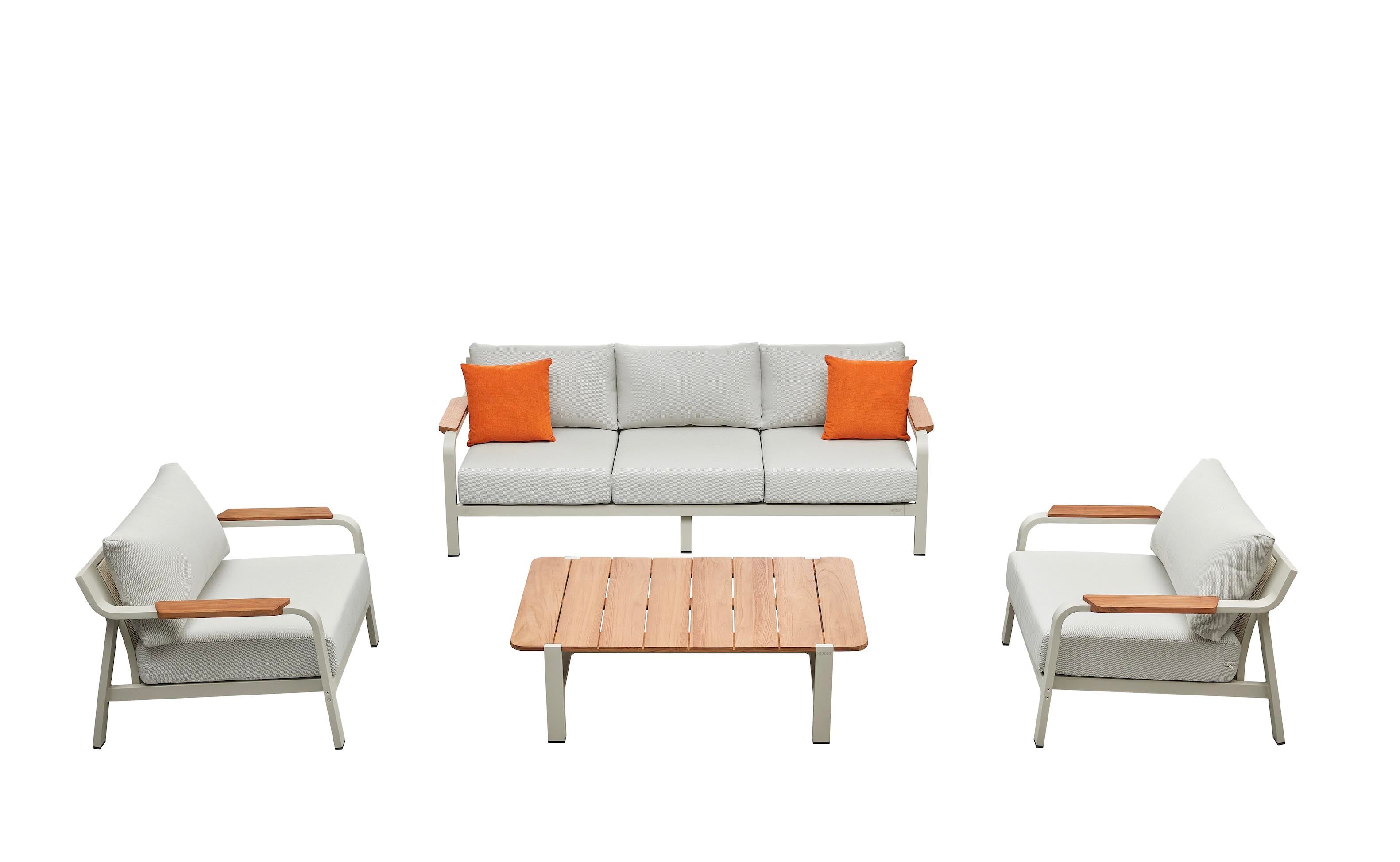 Ce salon d'extérieur haut de gamme est composé d'un grand canapé 3 places, d'une table basse qui comportent un plateau en teck et de deux fauteuils.